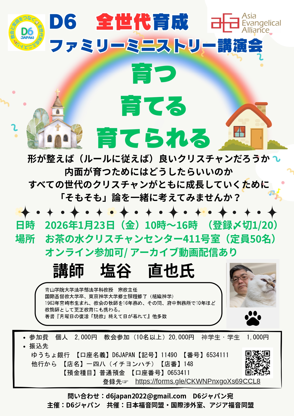 D6の働きは、申命記6章に基づき、教会と家庭をつなぐ「全世代の弟子育成・ファミリーミニストリー」です。教会と家庭がつながり、すべての世代がつながって、主イエスの弟子として、神の家族として育つこと、主の大宣教命令の遂行を目指します。アジア福音同盟とJEA国際渉外室が協力しています。